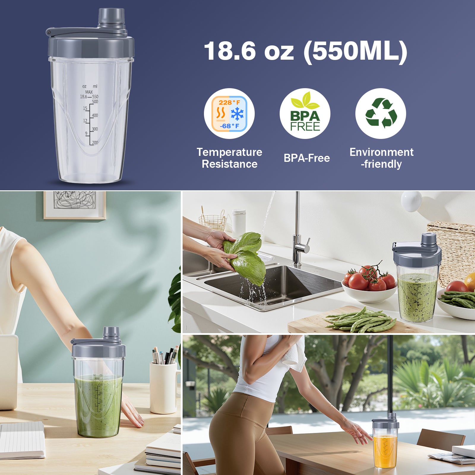 18 oz / 550 ml blending bottle, dishwasher safe. Cup size: 8.27 x 4.53 inches